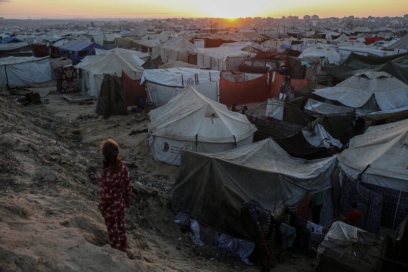 The sun rises over tents sheltering displaced Palestinians in Nuseirat, central Gaza Strip, on 7 October 2025.